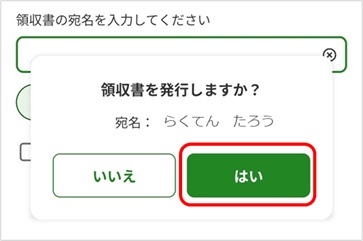 3.宛名入力画面が表示されますので、宛名をご指定いただき「領収書の発行」ボタンをタップします。