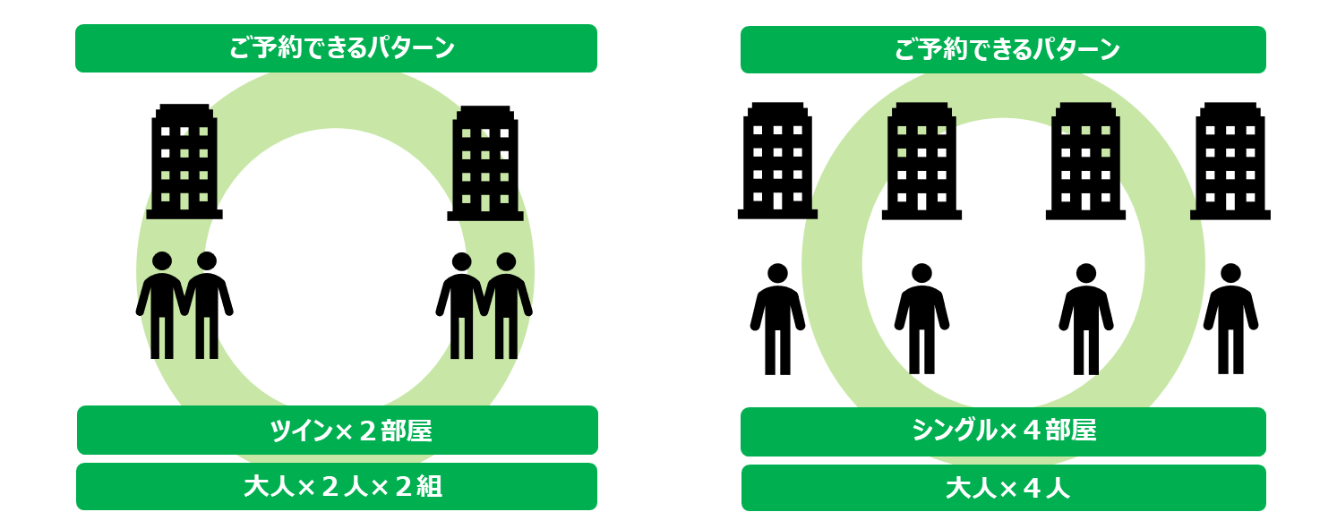 複数部屋の一括予約は、「1部屋あたり」の宿泊条件(人数・部屋・大人/子ども)が同じ場合に予約できます。