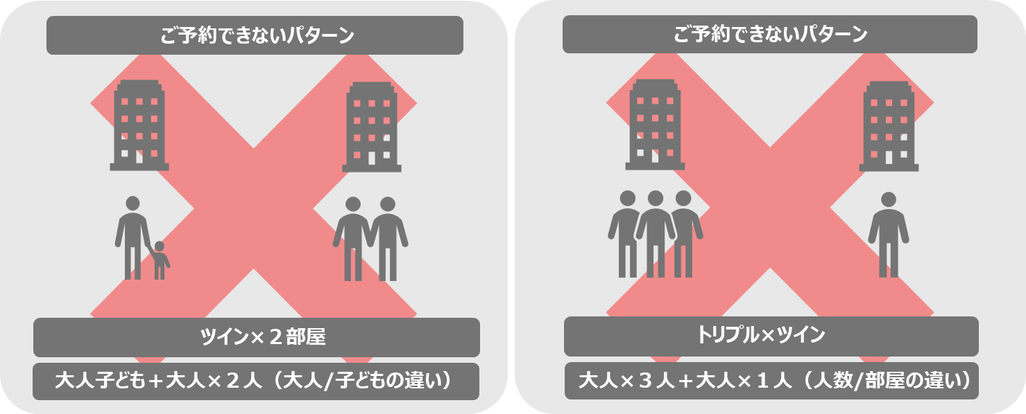 宿泊条件が異なる場合は一括予約はできません。個別でのご予約をお願いいたします。