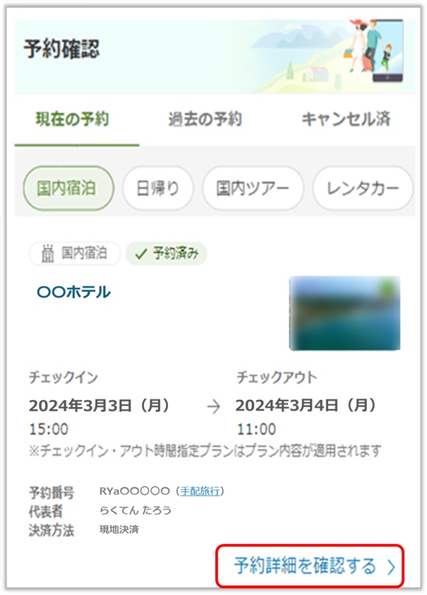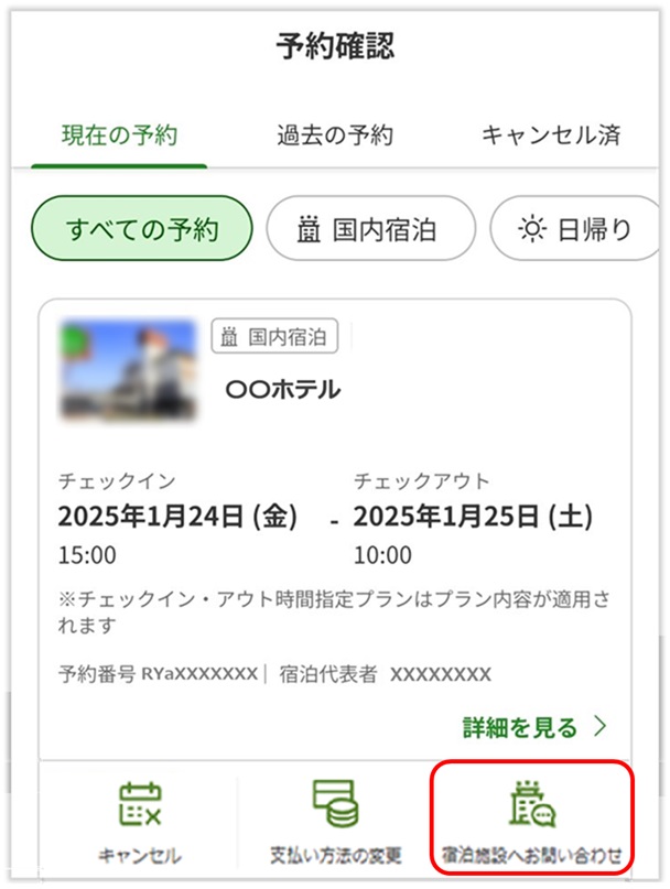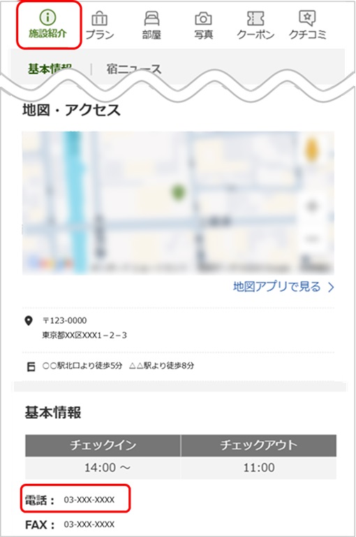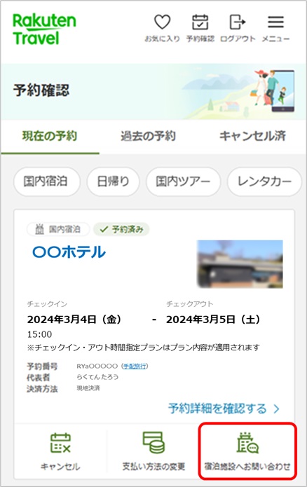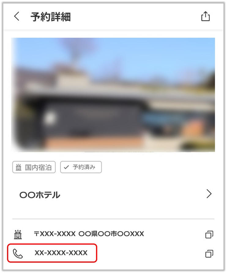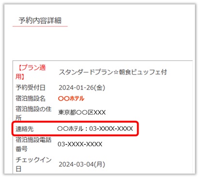 宿泊施設ページ、もしくは予約確認ページより宿泊施設の連絡先をご確認いただけます。電話番号