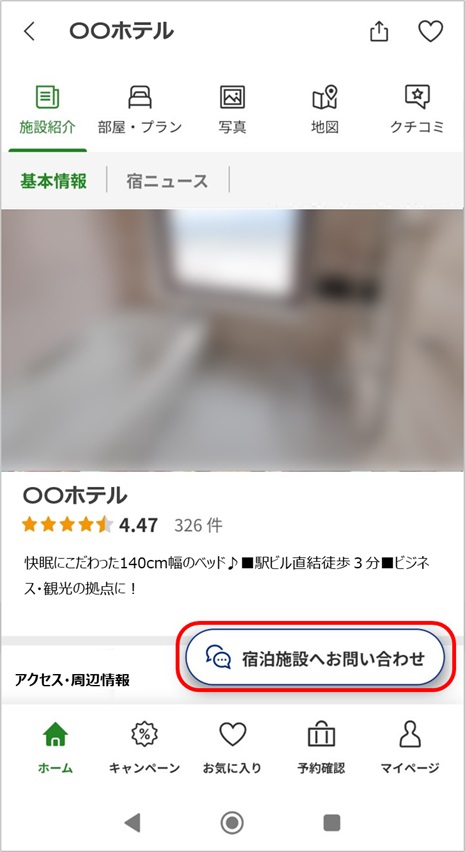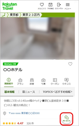 メッセージフォームご利用の際は、楽天IDでのログインが必要です。また、一部の宿泊施設のみご利用が可能です。※以下の手順で表示されない宿泊施設については対応していないため、お電話にてお問い合わせをお願いいたします。